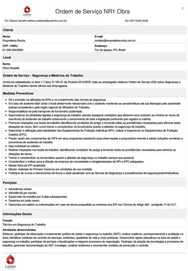Emita ordem de serviço NR 1 com agilidade, documentando medidas de proteção, com recursos de: cabeçalho preenchido automaticamente, questões de conformidade e não conformidade, fotos com marcação de data, hora e local e muito mais.