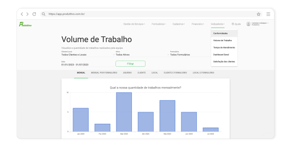 Os gestores têm acesso a um painel com uma visão geral sobre a operação, podendo acompanhar toda a rotina da equipe, como atividades atrasadas, em andamento, finalizadas e novas solicitações.