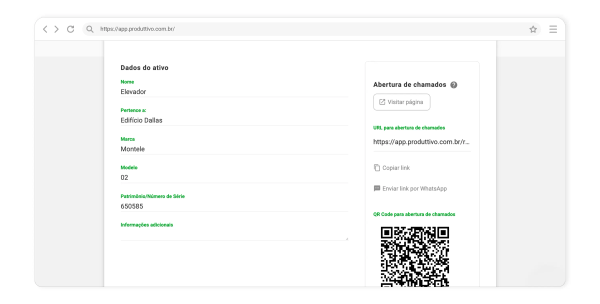Página personalizada para solicitação dos clientes, que pode ser através de um link para a página de chamados ou pelo QR Code instalado nos ativos.